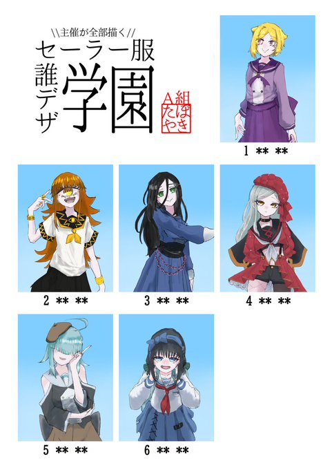 #セーラー服誰デザ_A組 #セーラー服誰デザ_B組 セーラー服の誰デザです!全部描きました! 私も参加者側でも描いてるので、ツリーのツイートから是非投票お願いします!2月11日まで投票できるのでちゃんと当ててください 解答用紙もツリーにぶら下げておきます💥