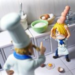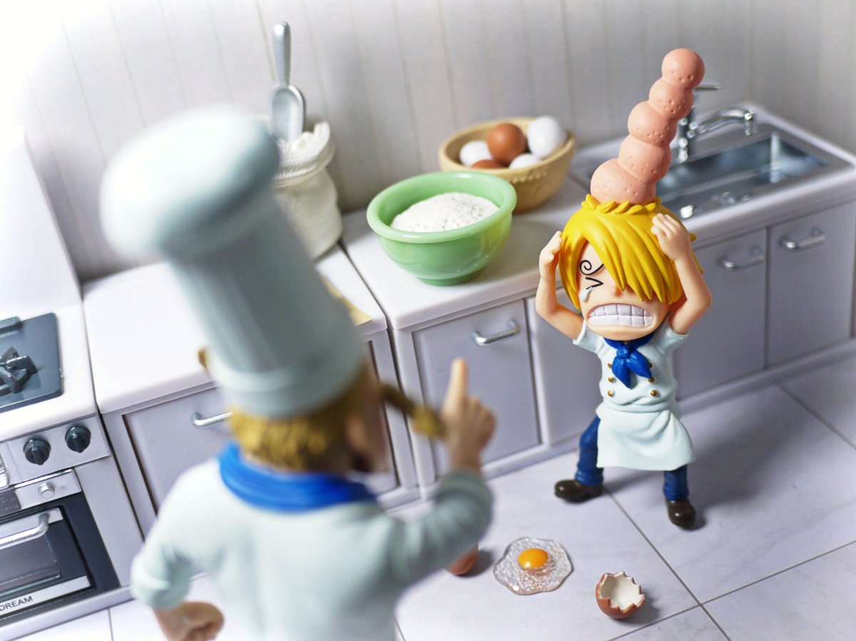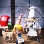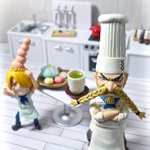 #夜のフィギュア撮影会 2/13 お題 『作』5分遅刻^^; ゼフにパン作りを教わるチビナス。 #onepiece #sanji #サンジ #zeff #ゼフ #WCF #ガチャガチャ #カプセルトイ #にゃんこパン屋さん #システムキッチンマスコット