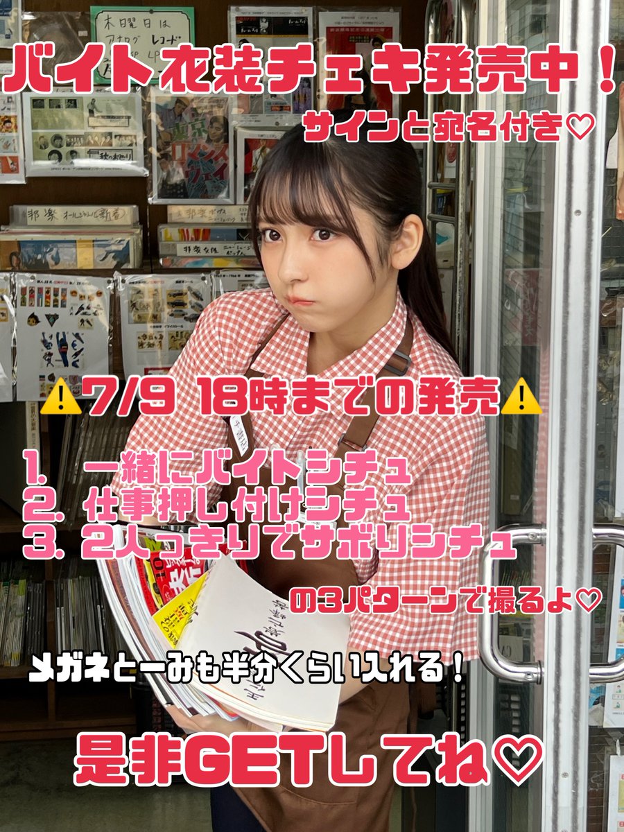 【バイト衣装チェキ発売中✨】 (サイン宛名付き♡) ⚠️7/9 18:00までの発売⚠️ 月刊エンタメ #ゼロイチバイト の企画で着た書店員バイト衣装のチェキ🫶 サボりシチュでは衣装着崩したり()するからギャップ感じてほしいな🥺 絶対ゲットしてね🥺❤️ ⬇️ページの下の方に購入欄あります!… twitter.com/i/web/status/1…