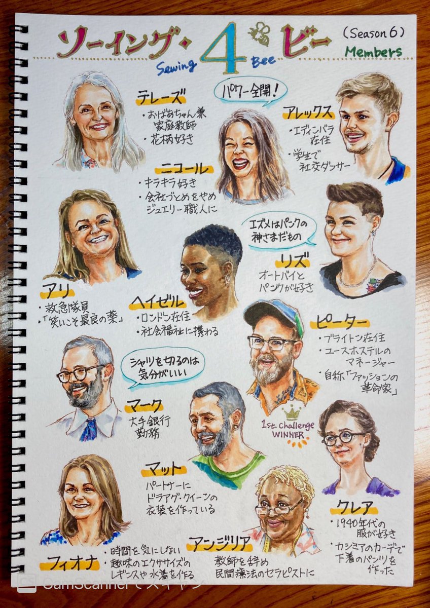 #ソーイングビー #ソーイング・ビー4 第2回の放送に間に合わず無念ですが、今回もメンバー表を描きました。お役に立てば嬉しいです。 12人もいるのでいつもの3人は入れられず。 アリが全然似てなくて申し訳ないので第2回で映った素敵な笑顔を別紙に描きました。アリの髪すごく綺麗だなあ。