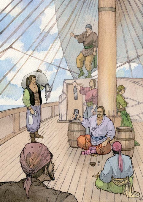 ソード・ワールドガイドシリーズの一枚。何か船乗りが酒盛りしています。(^w^) #illustration #watercolor #イラストレーション #水彩画 #米田仁士 #HitoshiYoneda #SwordWorld #ソードワールド