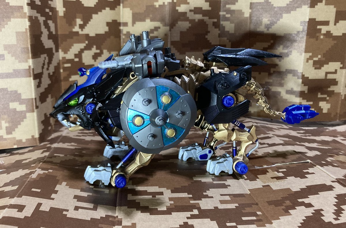 #今年作ったプラモ晒そうぜ 「ワイルドライガー・イクス」 赤外線放射抑制能力を持つ黄金の骨格をした唯一無二の中型ライオン種。 その特製を活かして、ステルス機能に特化したドライパンサーのアーマーとマシンブラストユニットを装備された。 #ゾイドワイルド #ワイルドライガー