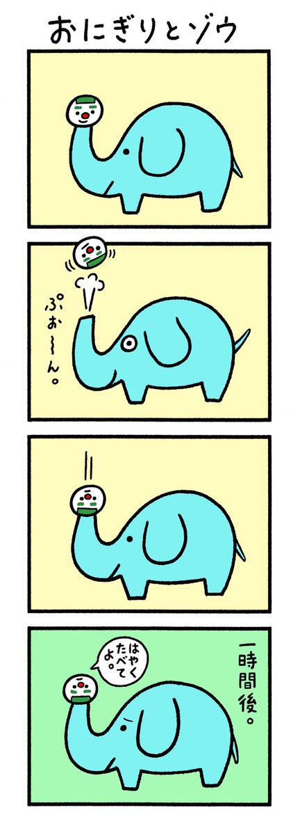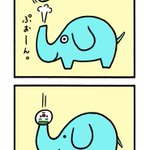 パイプの先にバスケットが付いていて「ふぅ〜」っと吹くとピンポン玉が浮き上がるオモチャで遊んでいたなぁ。小さなころに♪ #漫画が読めるハッシュタグ #秋の創作クラスタフォロー祭り #4コマ漫画 #4コマ #オリキャラ #おにぎり #吹き上げパイプ #ゾウさん