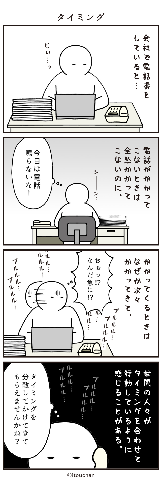 全然違う生活をしているどこの誰かも分からない人々が同じタイミングで同じような行動をする…という不思議🙄 #マイナビニュース にて会社漫画連載中✏️ news.mynavi.jp/series/kyomuto… #いとうちゃん #厭うちゃん #4コマ漫画 #漫画が読めるハッシュタグ #会社員あるある #タイミング
