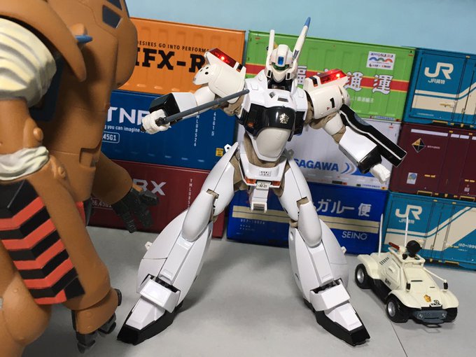 #夜のフィギュア撮影会 お題『逃』 盗難レイバーが逃走中!特車二課 第二小隊、犯人を確保せよ! #パトレイバー #機動警察パトレイバー #イングラム #brave合金 #超合金 #タイラント2000 #ソフビ #オモ写