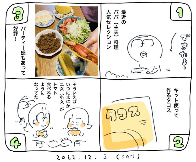 へいらっしゃい!かとう亭セレクション。タコス。我が家のタコスキットは、たぶんコレ。スーパーで帰る。レンチンですぐ食べられる皮、パリパリしてて美味しいよ♪ oldelpaso.jp/product/shells… #4コマ漫画 #illustration #イラスト #漫画が読めるハッシュタグ #タコス
