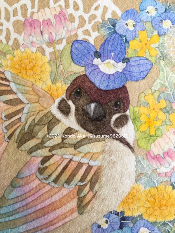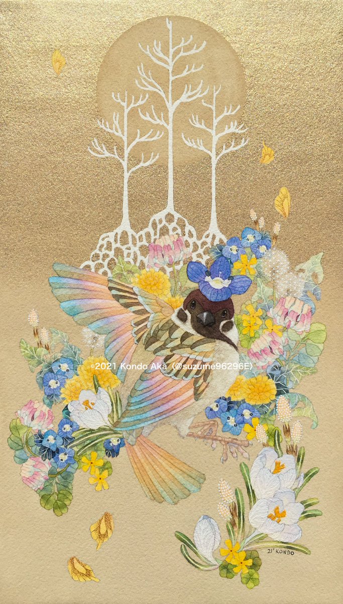 「いのちのむすび」 いのちの結び/おわりをテーマに、盛りの草花や踊る雀も、その華やかさと躍動の影に辿るおわり(後ろの枯木)があるからこそ、その刹那が美しくて愛おしいよね…という気持ちを描いた作品です #タツコン2021 投票ページもございますのでご利用ください😊 t2y.info/artist01/12957…