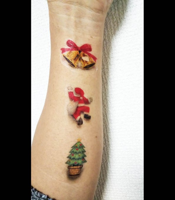 クリスマスタトゥーシールの貼りこみテスト! ベルの貼りこみでミスった!😭 ベルの右側が剥がれてしまいました... なかなか難しいのです💦 #絵描きさんと繫がりたい #イラスト好きさんと繋がりたい #クリスマス #タトゥーシール