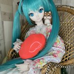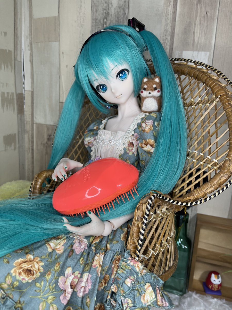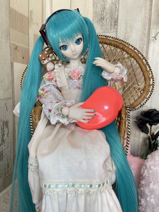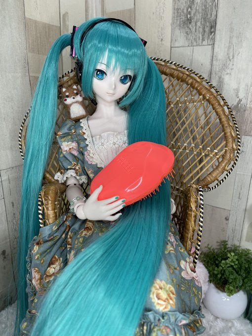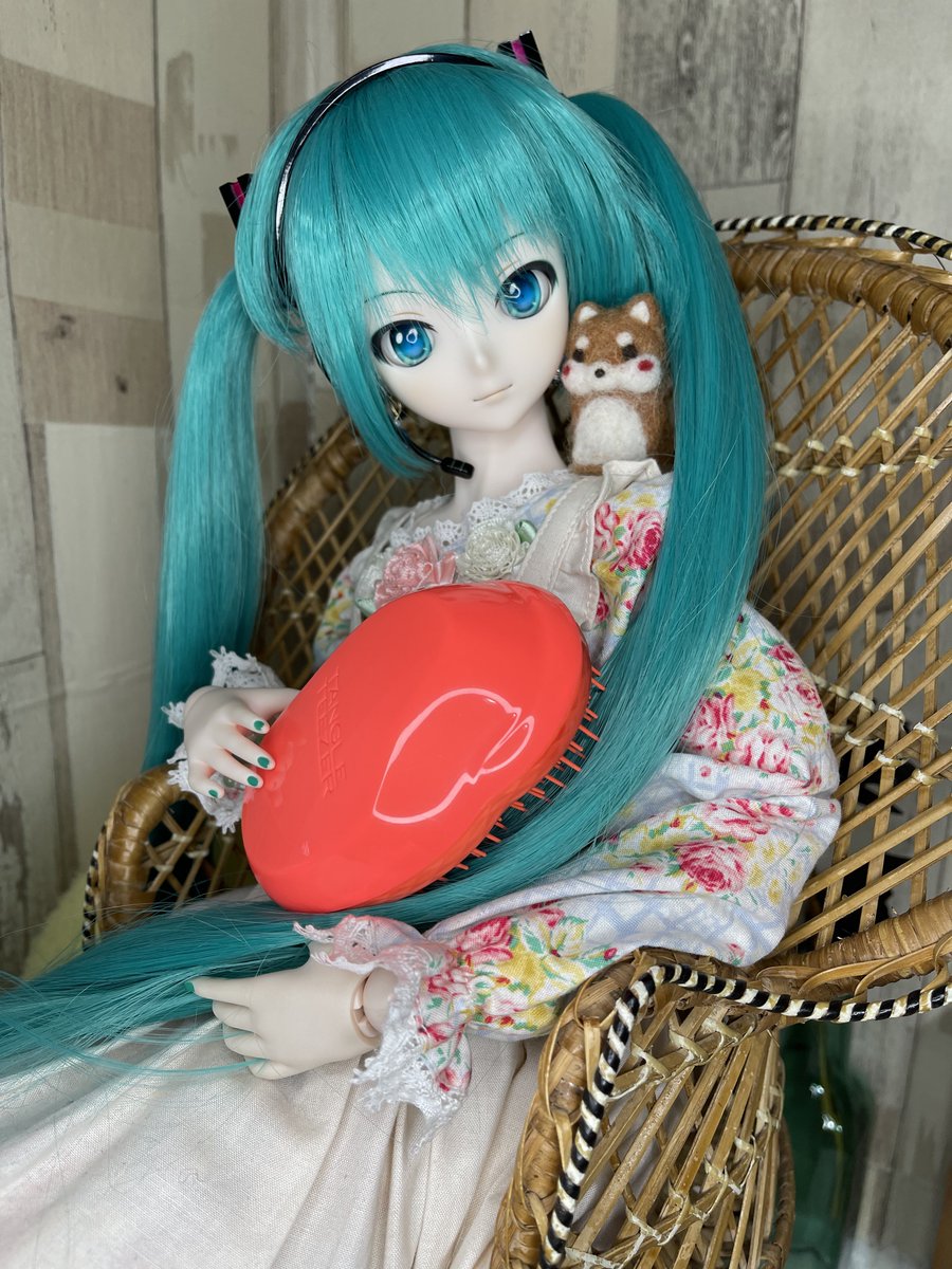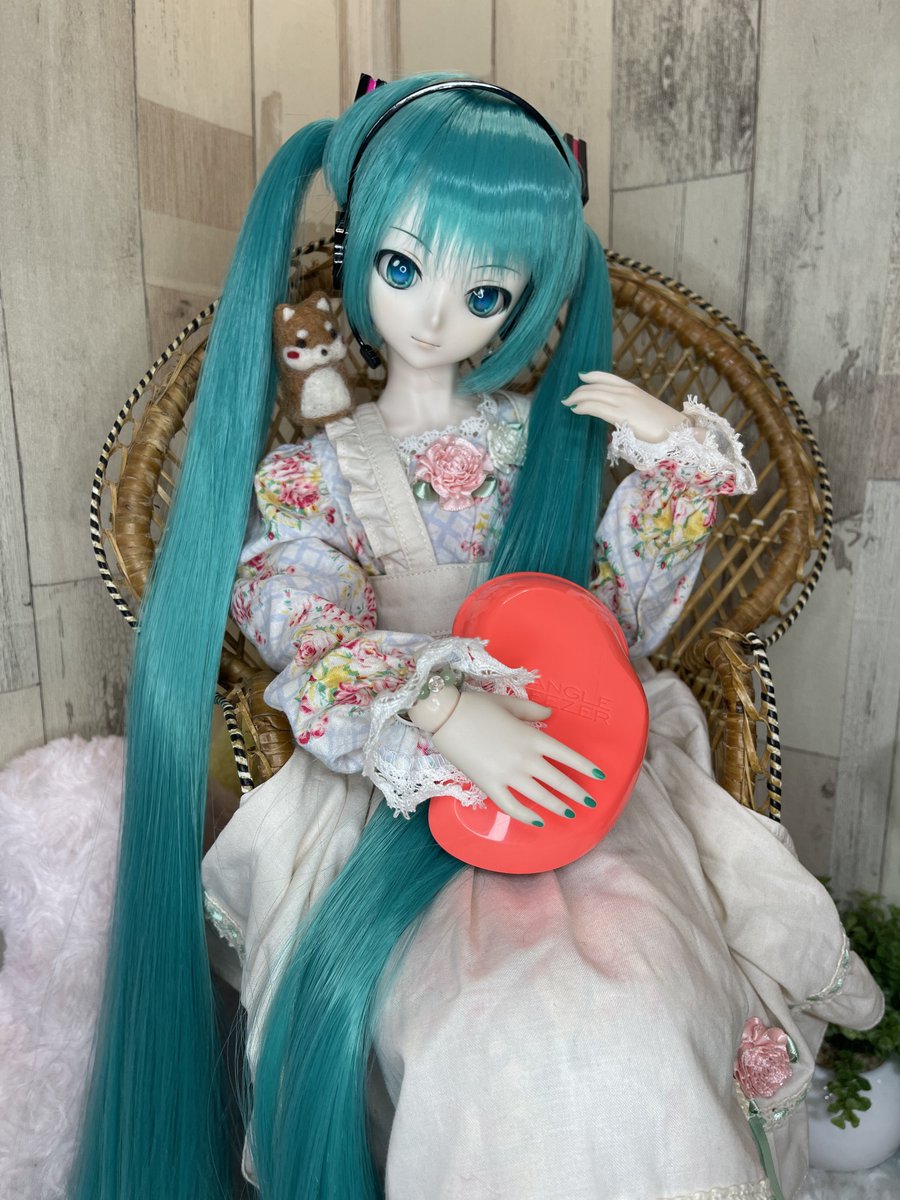 (๑و•̀ω•́)و{今夜のお題は、人気。 「ドールたちの間で人気のタングルティーザーで、ツインテのお手入れよ♡」 「わぅ」 (๑و•̀ω•́)و{さらつや!! #DD初音ミク #タングルティーザー #深夜の初音ミク撮影60分一本勝負
