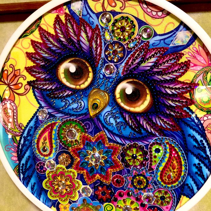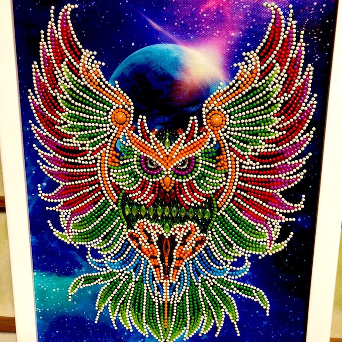 宇宙に羽ばたくフクロウ🦉🌍🦉 白いストーンは蛍光で部屋が暗くなると光るのです✨✨ #ダイアモンドアート #トレンドRT宣伝部 #アトリエの系譜R #みんなで楽しむTwitter展覧会 #芸術の輪 #美術ネットワーク #イラスト #イラスト好きな人と繋がりたい #art #artilljp #illustration #handmade #owl