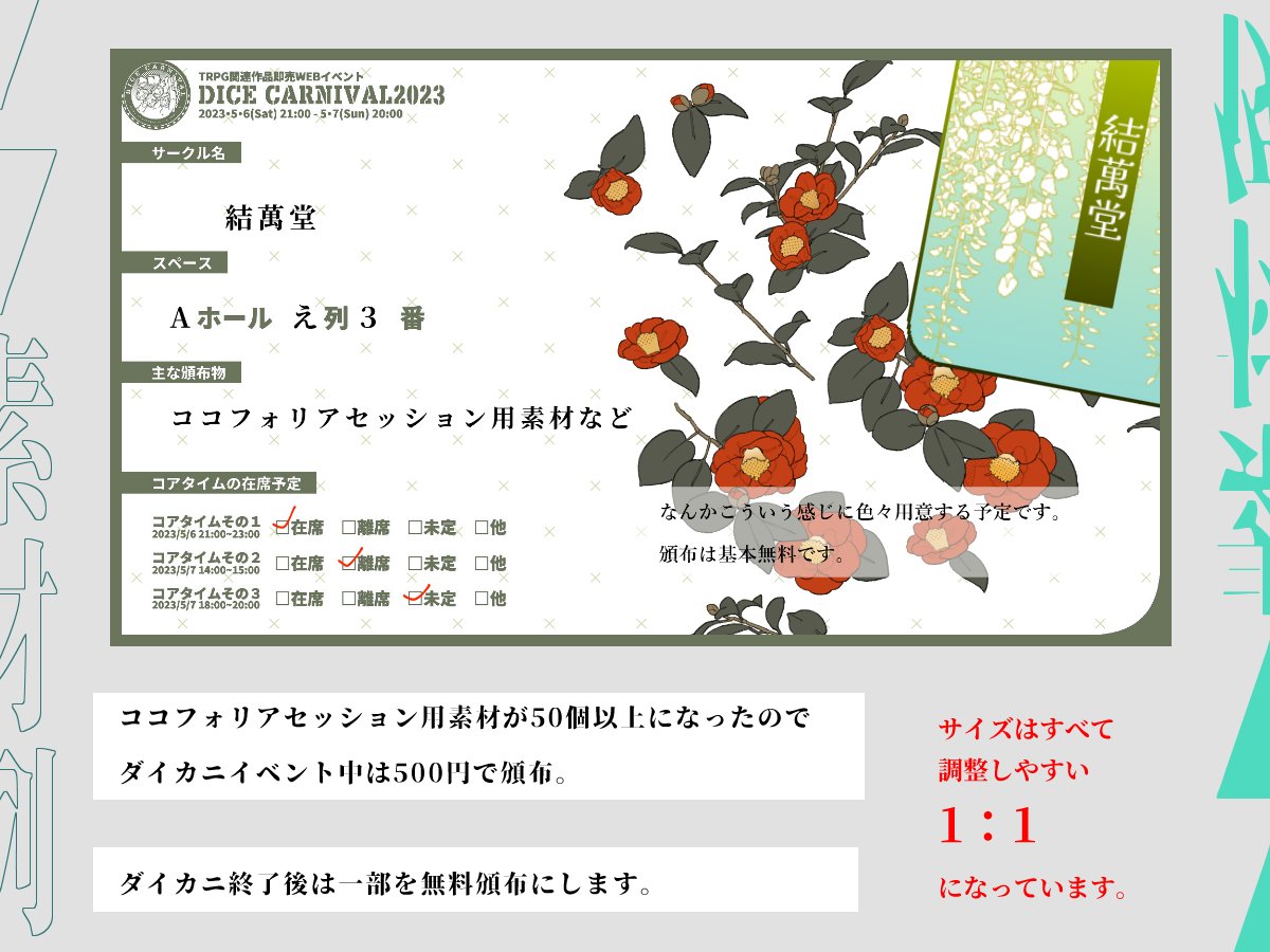 🐙ダイスカーニバル2023出るよ🐱 『立ち絵用補助素材』の 第3弾を頒布予定‼ 新作シナリオも…❓ 詳細は当日に告知予定‼ 🔻スペース Aホール - う列 - 4番 🔻日程 5月6日(土)21時 ~ 5月7日(日)20時 🔻booth 素材:3-necoze.booth.pm シナリオ:akitako.booth.pm #ダイカニ2023