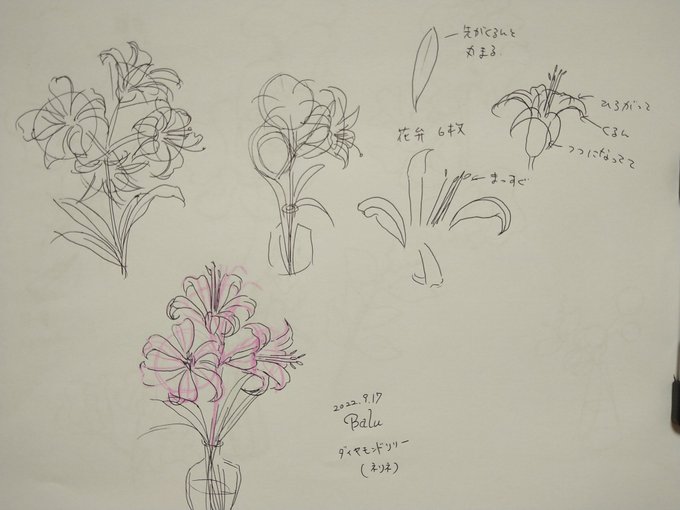 ダイヤモンドリリー 彼岸花と同じ構造 クルンと丸まる花びらの形が難しい〜😆💦 花びらの縁がヒラヒラ~としてるのもあるみたいなのでチャレンジしようかなぁ。 …ハガキに5つ収まるかな😅💦 #イラスト #絵描きさんと繫がりたい #ダイヤモンドリリー #花