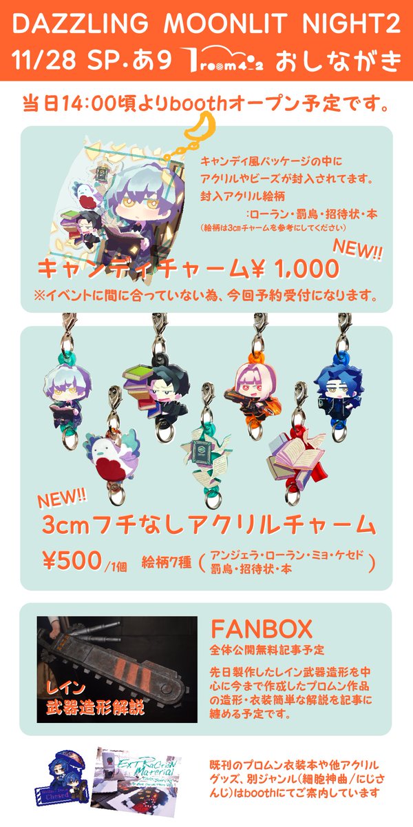 11/28pictSQUAREにて開催のDAZZLING MOONLIT NIGHT2 sp.あ9【room402】のお品書きです!キャンディチャームのみ納期確認不足でイベントに間に合わなかったので予約となります!ご注意ください~!また、プロムン作品造形の簡単な説明記事をこれから作ります! #ダズムン2お品書き