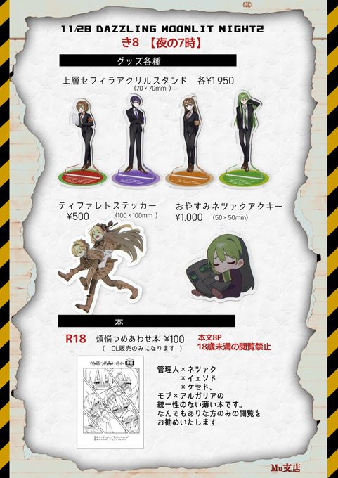 #ダズムン2お品書き 11/28プロムンWEBオンリー【DAZZLING MOONLIT NIGHT2】にて、スペース【こ13】で出ます!入ってすぐ左にいるよ! 既刊はLobotomy Corporation職員メイン漫画、新規はアブノマステッカーと(出せたら)無配職員漫画出します~!ショップはBOOTHからです! よろしくお願いしま~す!🤗