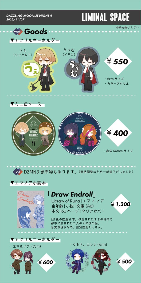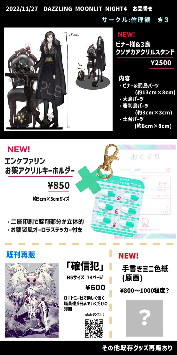 11/27「DAZZLING MOONLIT NIGHT4」 スペース【き3】倫理観 新作はクソデカビナー様アクスタ、エンケファリンアクキー、原画(作成中)です 前回ダズムン発行の完売してた既刊、グッズ再販 よろしくお願いします☺️ #ダズムン4お品書き