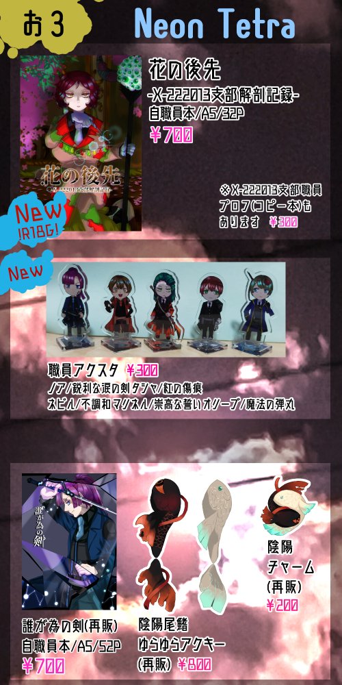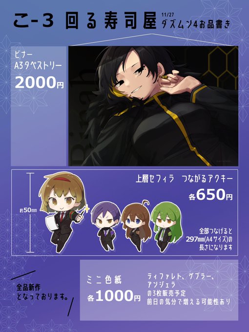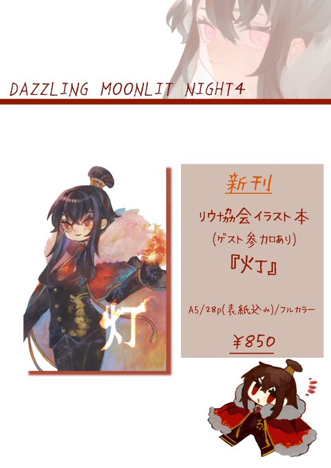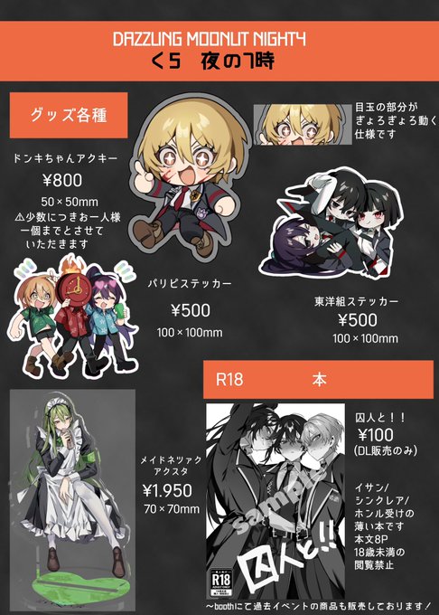 #ダズムン4お品書き 11/27(日)pictsquareで開催されるDAZZLING MOONLIT NIGHT4のお品書きです。 新作はアンソロジー、アクキー(ホクマービナー)、色紙原画となります。 各頒布物の詳細はツリーをご覧ください。 当日は会場左上【あ5】でお待ちしております!!