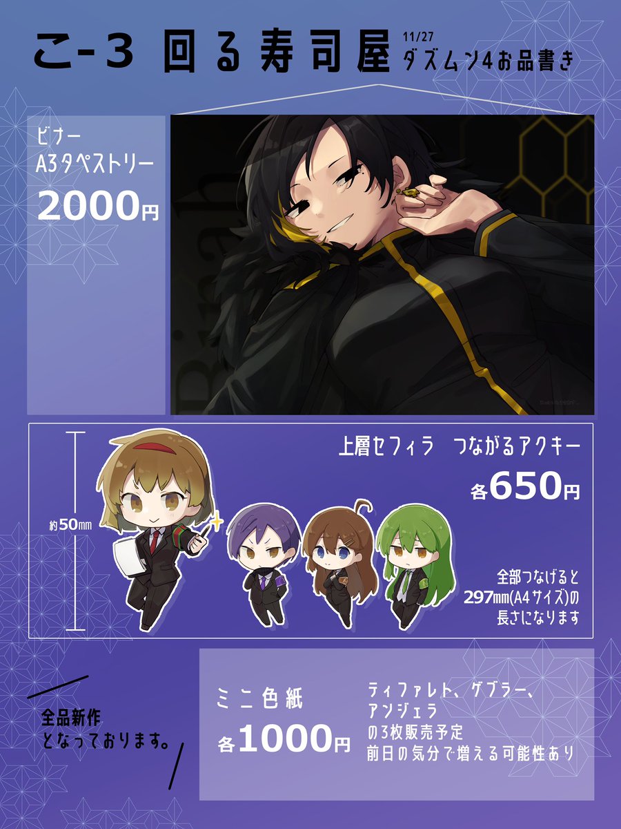 #ダズムン4お品書き お4/夢見童 にてスペースいただいております! 新作は自職員コースターセットとピクファク製カロンちゃんタペストリーです、BOOTHは当日開場まで閉めてます クリアファイルとアンジェラちゃんアクスタセットは残部少です どなたさまも楽しく過ごせるイベントになりますよう💪🐡💪