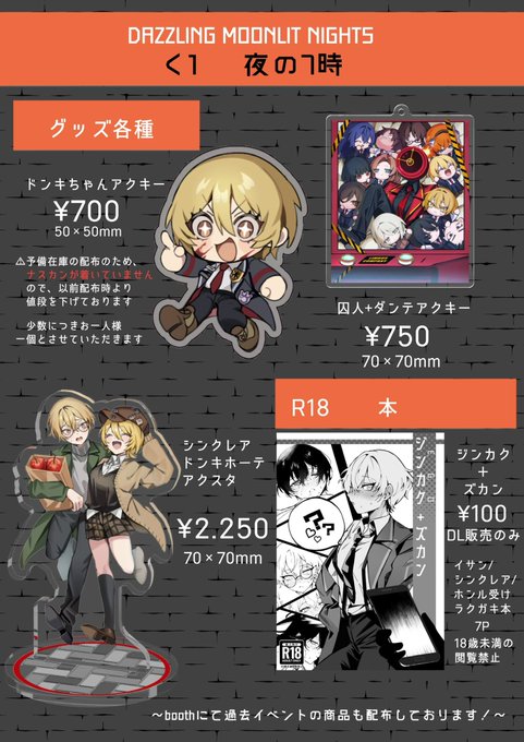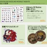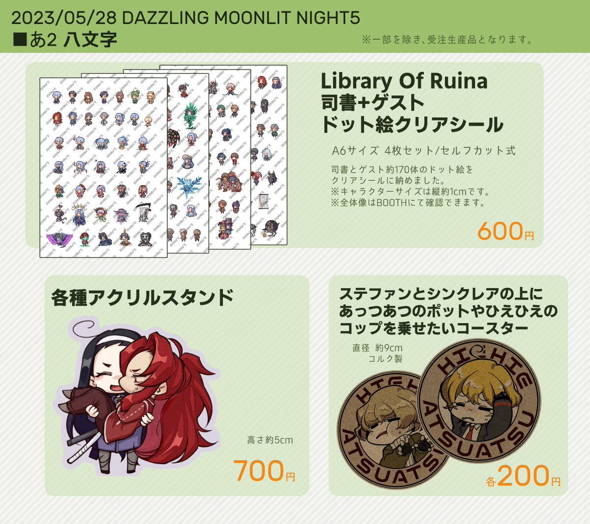 2023/05/28 DAZZLING MOONLIT NIGHT5/あ2 【八文字】 ドンキホーテa.k.aどんちゃんのグッズやらなんやらを頒布予定です。 図書館のシールも再販予定です。 終止符でも何か出したいなあと思いつつ。 #ダズムン5お品書き