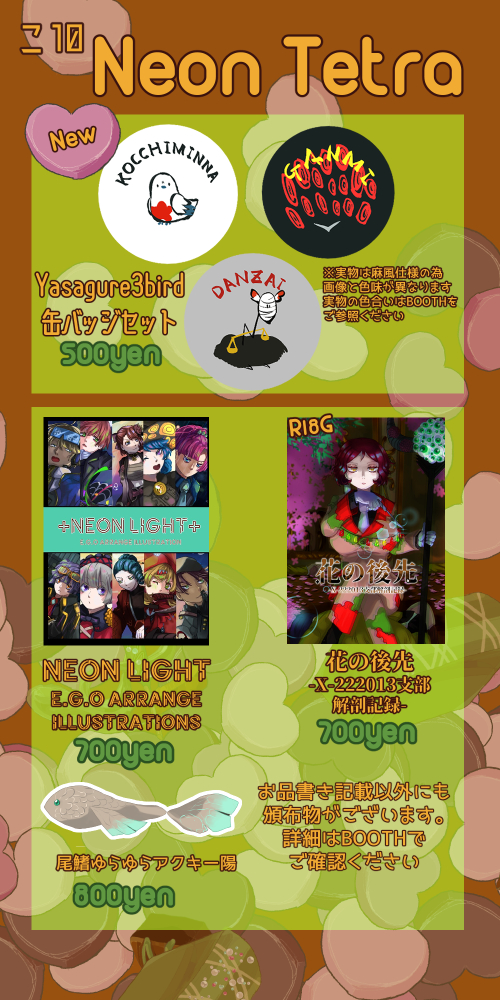 5/28 DUZZLING MOONLIT NIGHTS5こ10【Neon Tetra】で参加します。お品書き以外にも頒布物がございますので、詳細はBOOTHも御覧ください。よろしくね!! #ダズムン5お品書き