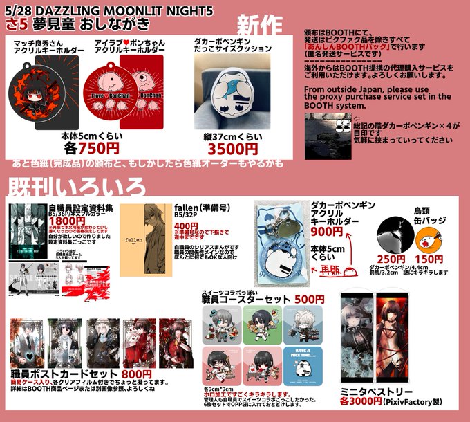 #ダズムン5お品書き さ5 夢見童 にてお待ちしております! ここに乗せてないグッズもありますので開場したらぜひBOOTHをみにきてください、よろしくな ※頒布予定の色紙については、ここにリプでつなげる感じでご案内します 価格は3000円と4000円辺りで考え中です