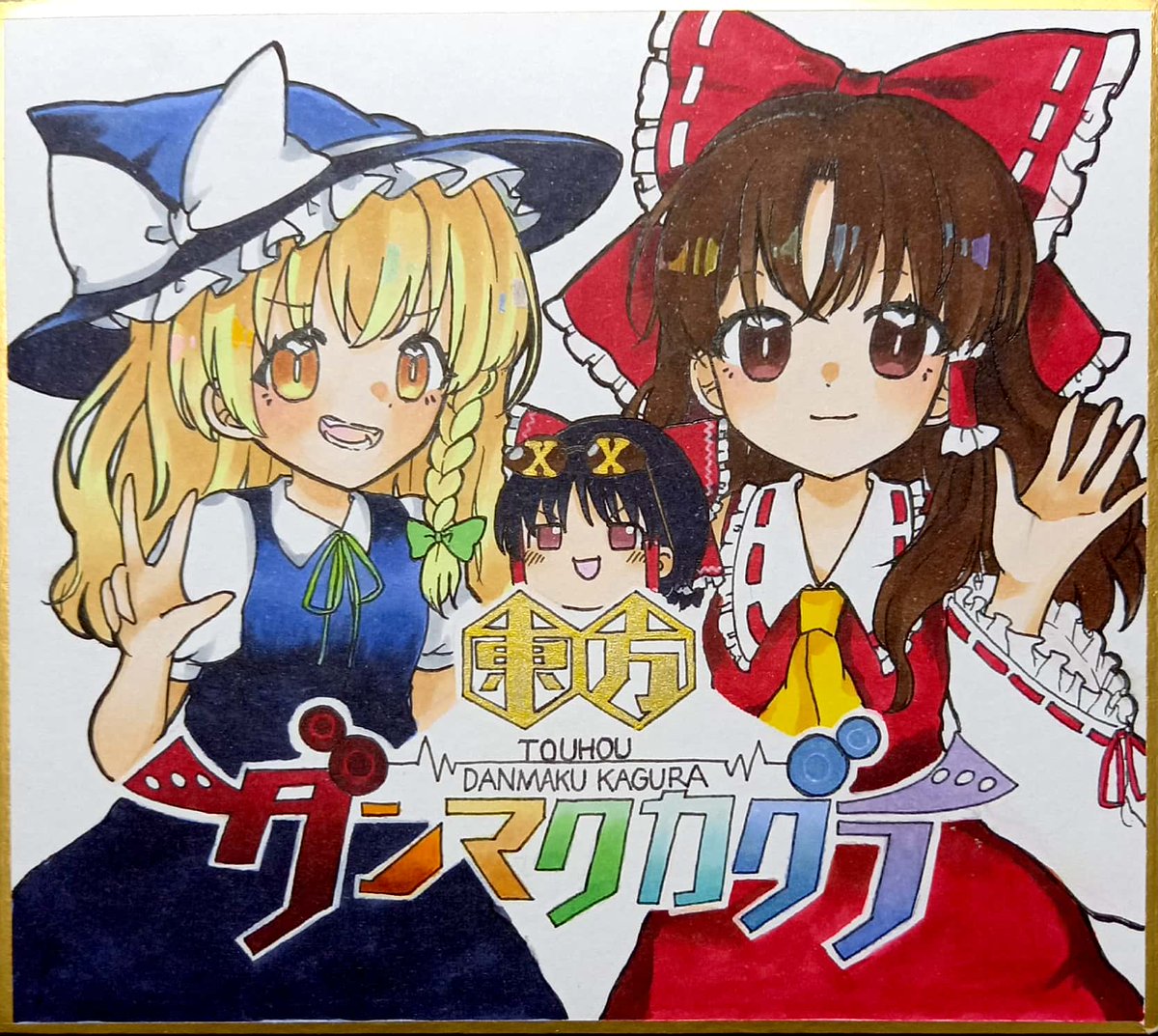 #ダンカグ描き納め2021 やっぱり主人公組を!!! 色紙に描いてみましたよ(∩ˊᵕˋ∩) ロゴを描くのに数日を費やし... 結果こんなギリギリに...:( ;´꒳`;): アンノウンXさんのサングラスの文字と「東方」はラメ入りペンでキラキラですよ〜°˖✧◝(⁰▿⁰)◜✧˖° いい描き納めになりました!!