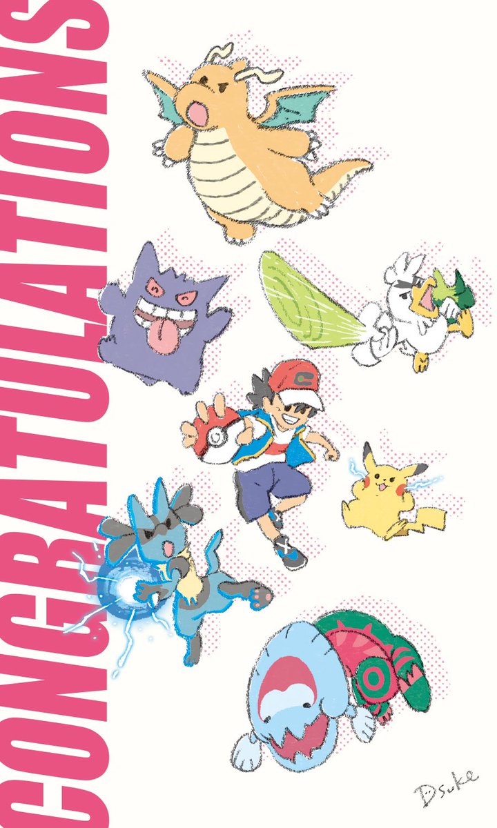 サトシくん、サトポケ達、優勝本当におめでとう✨ 今日は新無印がスタートして3周年🎉 カイリュー、ゲンガー、ルカリオ、ネギガナイト、ウオノラゴン達と友達になってもうそんなに経つんだね☺️ #アニポケ #サトシ世界チャンピオンおめでとう #ダンデVSサトシ決着 #イラスト #ポケモンイラスト