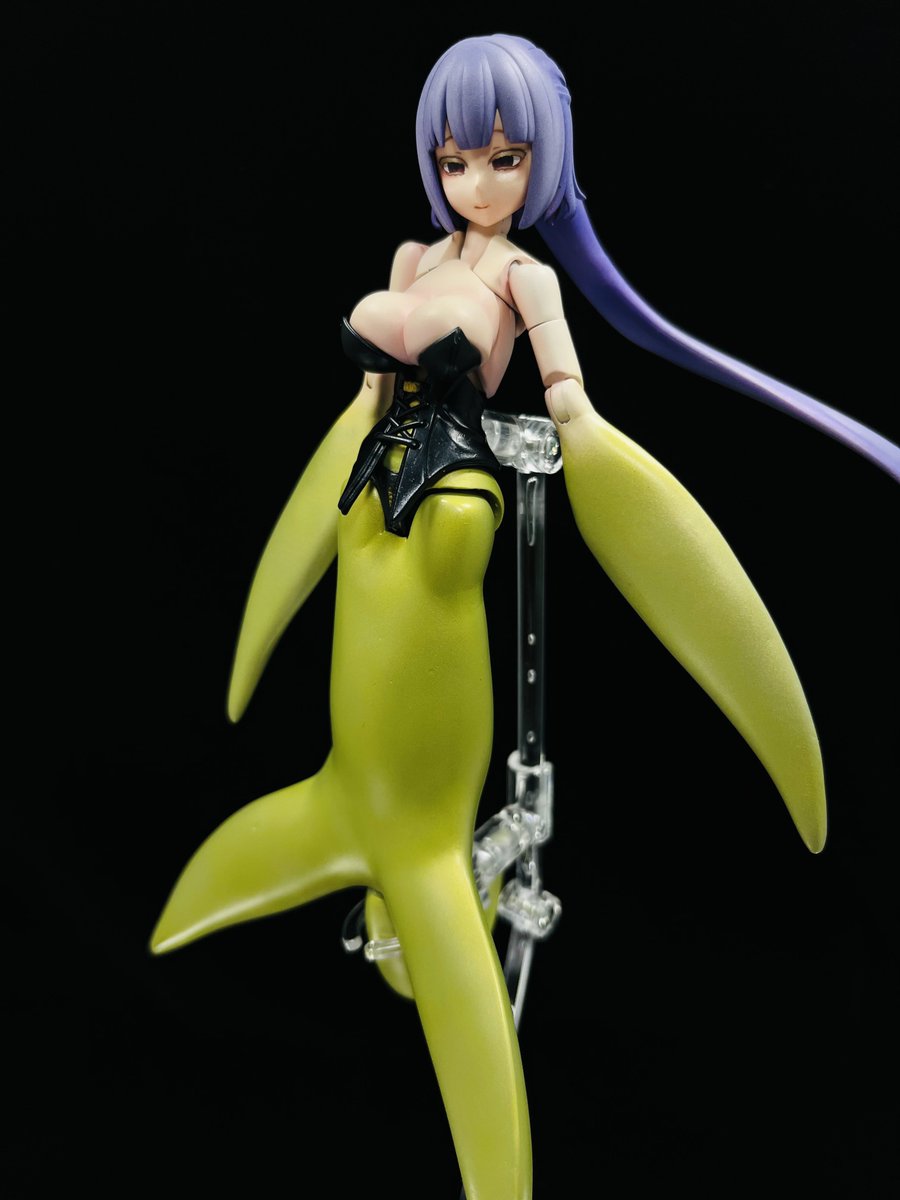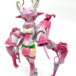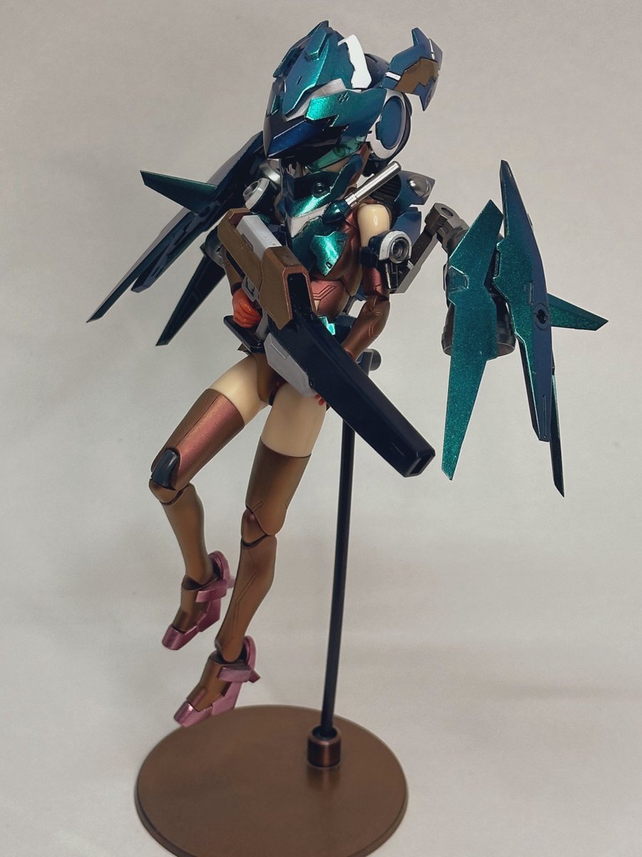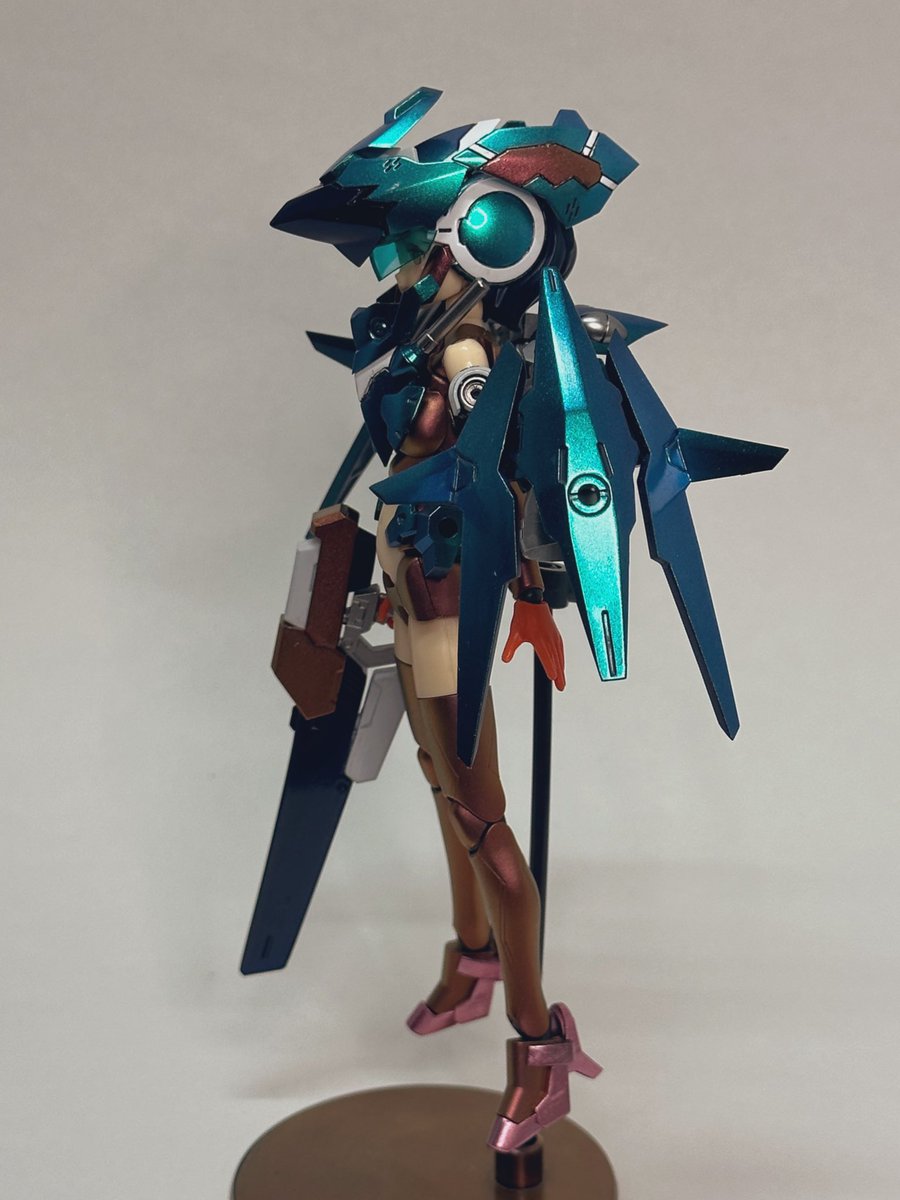 久々の塗装完成品です。メガミデバイスホーネットとヘキサギアメッサーフロートを合体させた「ハイパーホーネット」です。 背中のエナジーウィングとブースターの高速移動で切り込み、3本のビームサーベルで相手を切り裂きます #メガミデバイス #ダーウィンフレンズ