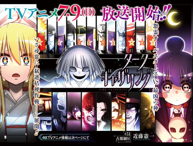 本日発売のジャンプSQ.7月号に『#ダークギャザリング』50話を掲載していただいております。 ついに50話…! おかげさまで50話到達…! また、なんとアニメ特集で夜宵ちゃんと螢多朗君の声優さんである #篠原侑さん と #島﨑信長さん のコメンタリーも載ってます! 漫画共々よろしくお願いいたします!