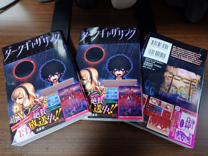 『#ダークギャザリング』13巻の献本が届きました。発売日は8月4日で装丁は写真の様になっておりますので目印にしていただければと思います。同時発売のジャンプSQ本誌の最新話、毎週のアニメと一緒によろしくお願いします…!