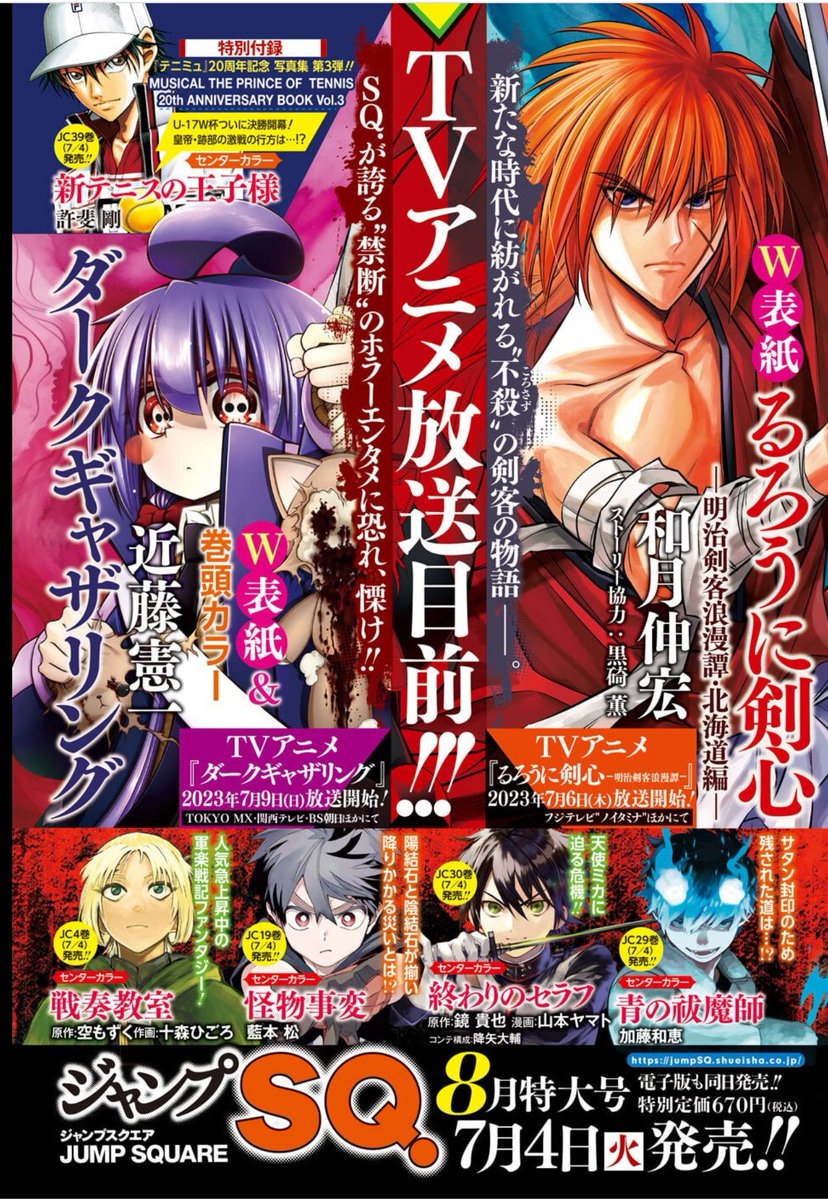 本日発売のジャンプSQ.8月号に『#ダークギャザリング』51話を掲載していただいております。 今回はなんと『るろうに剣心』とのW表紙、そして巻頭カラーです!そして7月9日から始まるアニメ情報に10日からのラジオ情報…。本編もついに明かされる神様の正体と内容盛り沢山です! よろしくお願いします!
