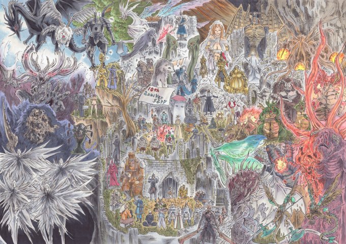 ダークソウル発売から10周年おめでとうございます!これから先も語り継がれていく名作だと思ってます。記念に描いたお祝いのボスNPC集合イラストです! #DarkSouls #ダークソウル
