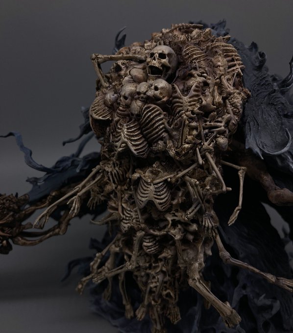 ダリ夫さん原型@dhalio 、「墓王ニト」完成しました!最初の死者、強大な王としての威容を出せるよう頑張りました〜。 後部のスケルトンの演出だとか素晴らしいセンスだと思います。 #DarkSouls #ダークソウル
