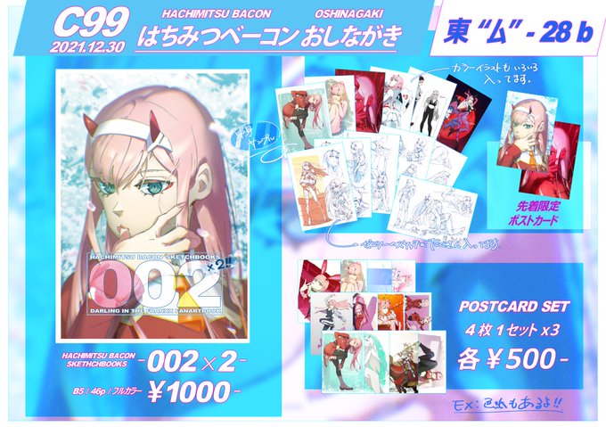 自分のサークル「はちみつベーコン」の当日のお品書きです。 ▼46pのフルカラーゼロツー本 ▼ポストカードセット +α 当日までに用意できた色紙 を予定しています! 1日目 東4 ム-28b です。 よろしくお願いします(。・・。) #ダーリンインザフランキス #ゼロツー #c99 #コミックマーケット99