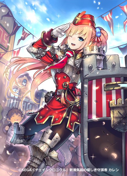 【宣伝】 本日リリース! #チェインクロニクル (セガ様) にて 『新進気鋭の優しき守護者 カレン』(CV #佐倉綾音) を描かせて頂きました🛡️ 街の皆を見守る&護る頼れるお姉さんとして描かせて頂きました😊 盾がとっても印象的な技を持っているので 必見ですっ! #チェンクロ