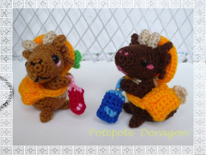 010 #作品画像で春夏秋冬 春 入園式【クリリとキリリ】 夏 海の日【マリンとアクア】 秋 ケーキ屋(食欲)【ビオラとスミレ】 冬 クリスマス【ときわ】 #minne #minne100問100答 #あみぐるみ #竜 #チビ辰 #ドラゴン