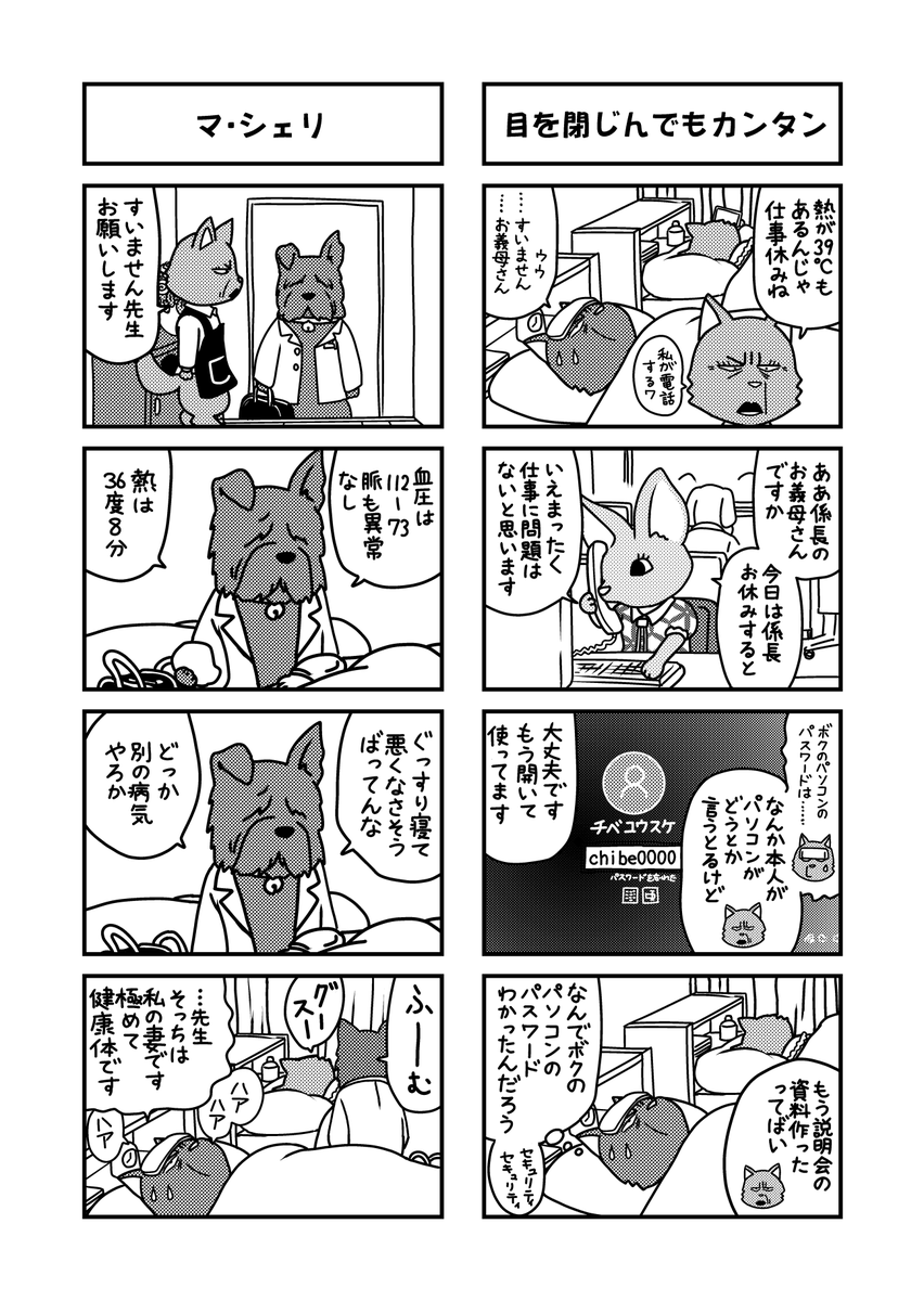 こんにちは。チベユウスケ係長再掲34回目です。パソコンのパスワード単純な職場の数は天文学的。 #パスワード #目を閉じればカンタン #マ・シェリ #チベユウスケ係長の憂鬱 #漫画が読めるハッシュタグ #動物マンガ