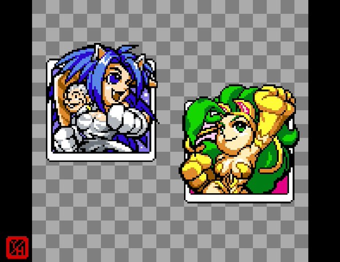 《オマケ》 チャムチャムとフェリシアのカラーリングを取り替えっこしてみた。 #カードファイターズ #サムライスピリッツ #ヴァンパイア #チャムチャム #フェリシア #カプコン #ネオジオポケットカラー #ドットアーティスト #ドット絵 #レトロゲーム