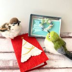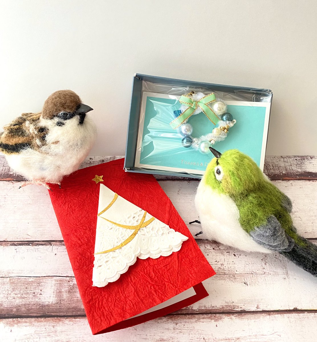 クリスマスプレゼントに贈ってくださると 聞いてクリスマスラッピング頑張りました〜🎄 期間限定のキャンペーンなので、 おまけのクリスマスリースもつけてます✨ #スズメ #すずめ #チュン活 #メジロ #クリスマスプレゼント #鳥好き #羊毛フェルト #みんなで楽しむTwitter展覧会