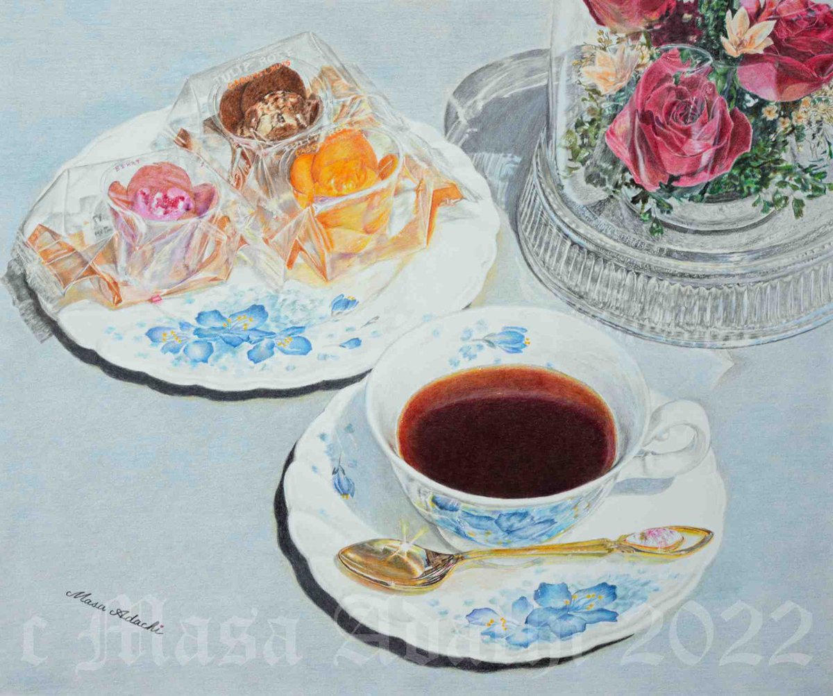 Coffee break F8 #色鉛筆画 何とか完成。 私としては、描き難いものを取り揃えてしまったようでした。😅明日、ちょっと修正するかも。 #ホルベインアーチスト #ファブリアーノエキストラホワイト極細目 #チューリップローズ #絵描きさんと繫がりたい