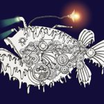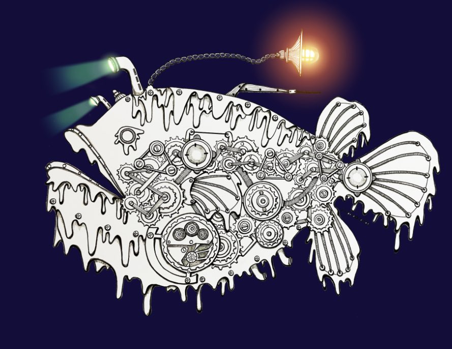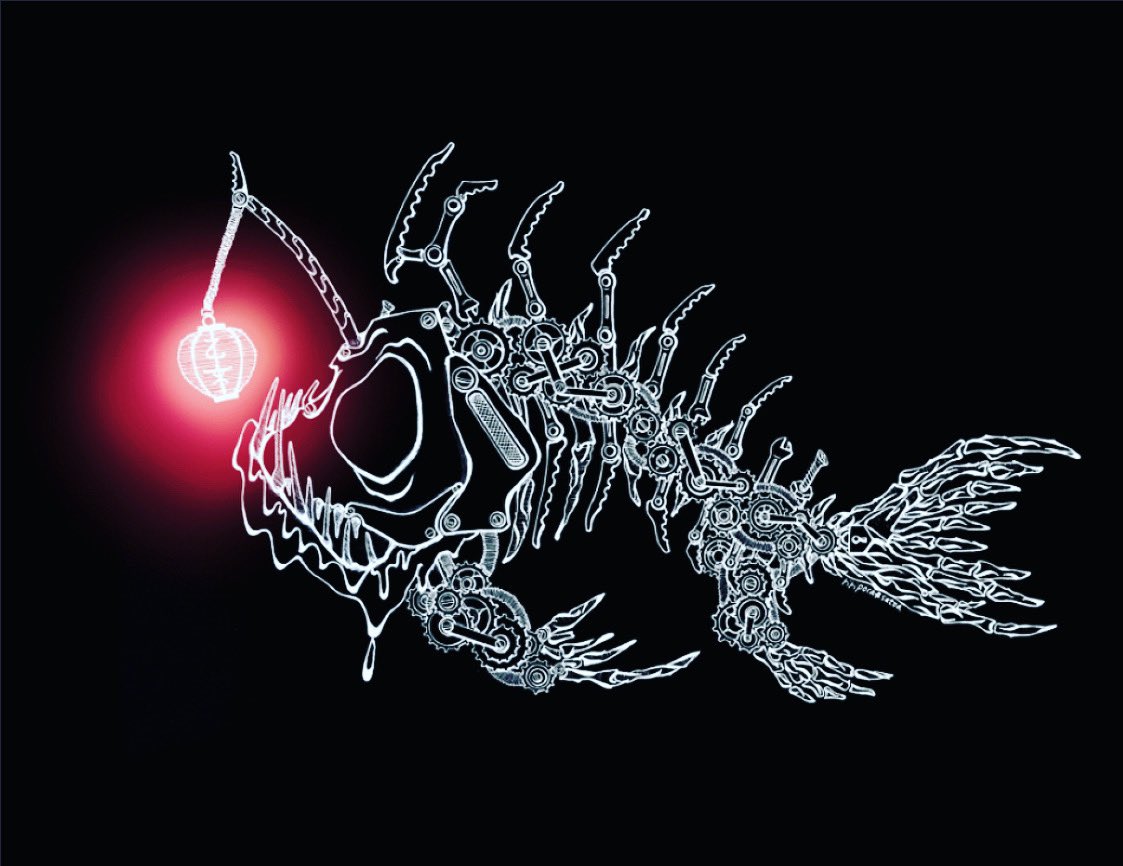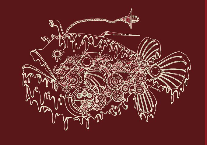 おはようございます(*´꒳`*) 廃人となっている金曜日💦 這いつくばって頑張りましょ💪 ⚙チョウチンアンコウ🦴⚙ #スチームパンクイラスト #歯車イラスト #ペン画 #チョウチンアンコウ #骨格