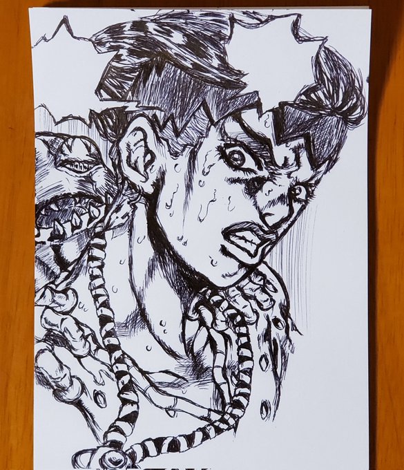 #岸辺露伴は動かない を振り返ってみました⑤ #背中の正面 #チープトリック #jjbafanart #illustration #ジョジョラーさんと繋がりたい #ねこ画伯 むかでや( @mukadeya_sendai )さんで開催されたカッパさん( @kazurindagane )の展示会の御礼に描かせて頂いたイラストのコピー版がこちらです。