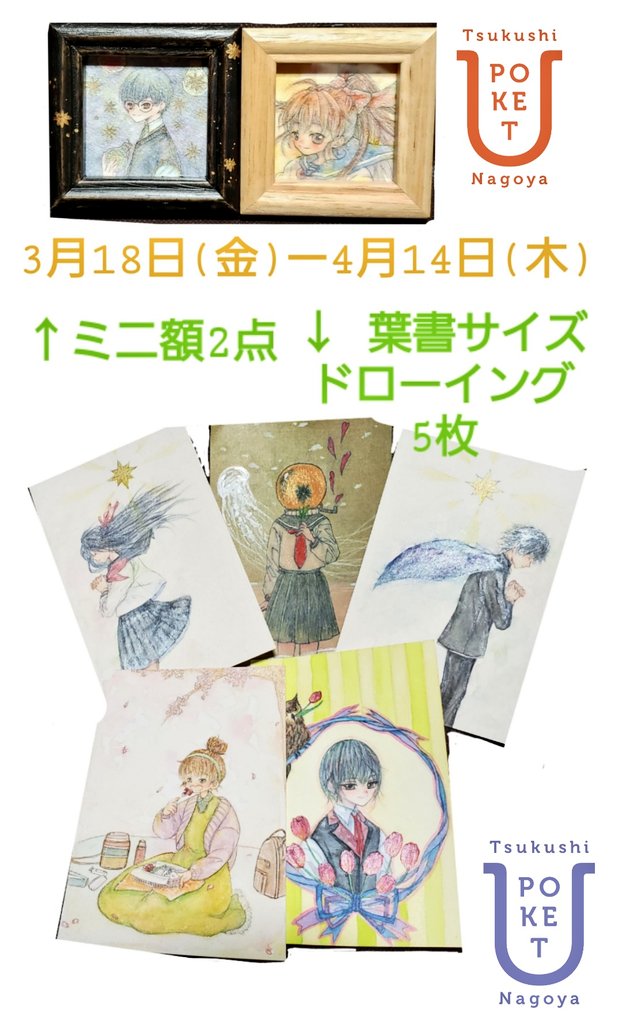 #ツクポケ販売作品 3/18~4/14/望森ゆき 画像①枚目:新旧作ドローイング作品、各5,000円 画像②枚目:ポストカード、各180円 ↓通販 suzuri suzuri.jp/yuki_mochimori 愛知県の新守山駅近くにあるアピタ内の土筆ギャラリーさんの一角にて展示販売されます! よろしくお願い致します!