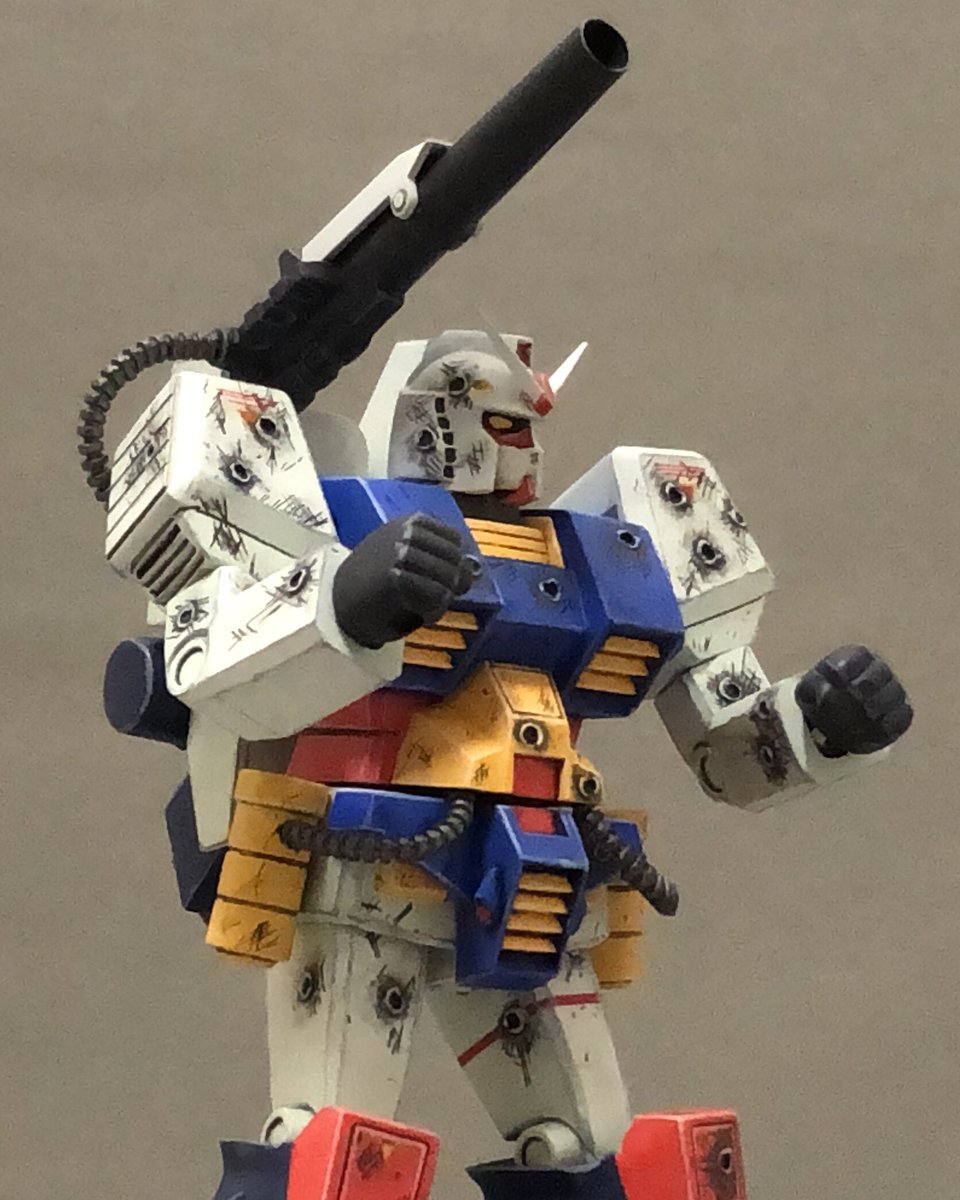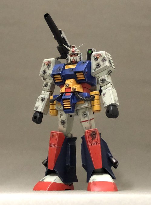 遅くなりましたが「1/144 パーフェクトガンダム」完成です😊 ジオン少年隊との戦い、ザクのロケット弾一斉発射で全身に被弾した状態を再現しました。 連載当時、ボンボンでこの姿を見た時は本当にショックでしたね😭 #プラモ狂四郎 #ツマツク2022延長 #ツマツク2022完成