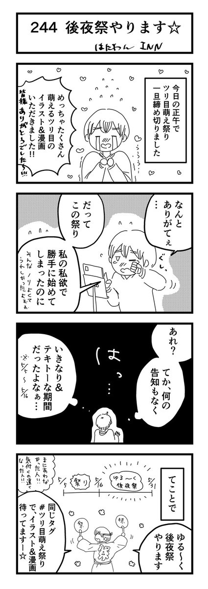 後夜祭やります☆ ※【ツリ目萌え祭り】後夜祭☆ ゆる~く開催します~🥰 (5/31正午まで☆) #ツリ目萌え祭り のタグをつけて、 イラスト・漫画を投稿してねー♪ #コルクラボマンガ専科 #6期 #漫画が読めるハッシュタグ #日記マンガ