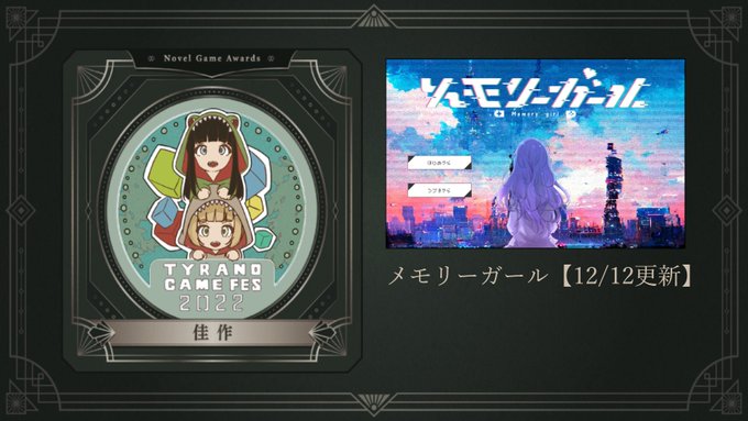 ❐お知らせ ティラノゲームフェス2022にて 「メモリーガール」が佳作を頂きました👏 わ~嬉しい~っ( ;;)応援して下さった皆さん、ありがとうございました!これからもゲーム作ります~! ↓ゲームはここから遊べます! novelgame.jp/games/show/7123 #ティラノゲームフェス2022 #メモリーガール