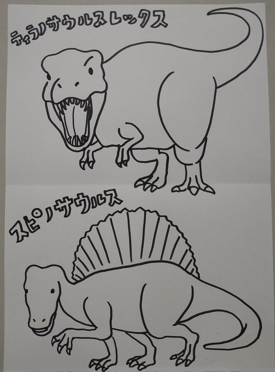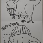 『恐竜塗り絵』 アオの大好きなティラノサウルス・レックス! そして二足歩行、四足歩行まだ謎のままの私の好きなスピノサウルスです😁(四足歩行して、水の中で魚捕まえててほしい!) #イラスト #ティラノサウルス・レックス #スピノサウルス #アナログ #恐竜 #絵描きさんと繋がりたい
