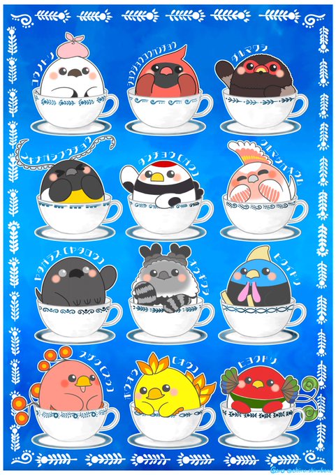 『ティーカップとりーず』 ティーカップにまるい鳥たちが入ったら可愛いかなと思って描いてみました😊 #イラスト #創作イラスト #illustration #ティーカップ #春の創作クラスタフォロー祭り