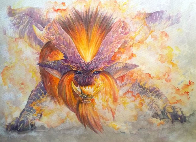 寒いですね~(゜▽゜*) こんなときは燃えるテオちゃんを眺めて暖まりませぬか?(逆に熱いし)🔥 #モンハンワールドアイスボーン #テオテスカトル #イラスト 透明水彩で描きました✨サイズはF4です(о´∀`о)かっこいいテオを描きたかったん❗️