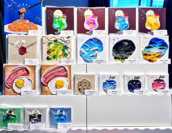 デザフェスレイアウトをなんとなく再現中💭雰囲気はだいぶいいんじゃないかな〜〜バタートースト描かなきゃ、、! #アクリル画 #絵 #絵画 #絵描きさんと繋がりたい #テクスチャーアート #デザフェス57 #デザフェスお品書き