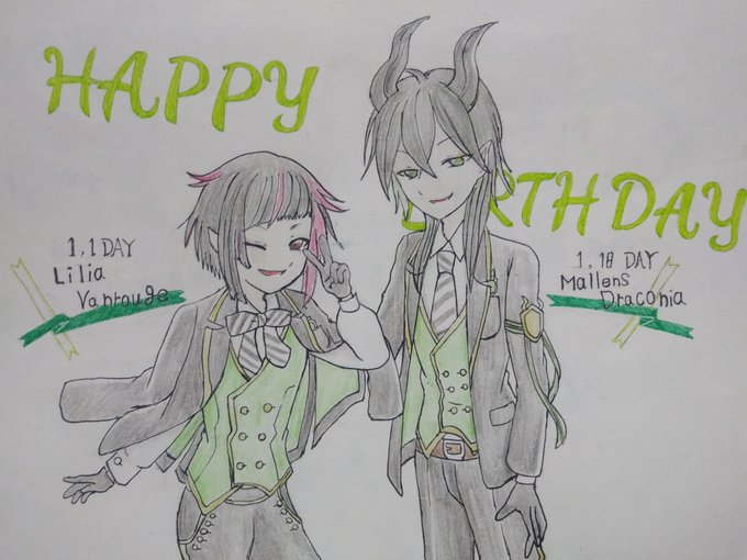 #ツイステファンアート #イラスト #ディアソムニア寮 #リリア・ヴァンルージュ誕生祭2022 #マレウス・ドラコニア誕生祭2022 またまた出遅れた誕生日イラスト(><) 1月はディアソオンリーバースデーだったのでカラーリングは統一しました(^.^) おめでとう🎉